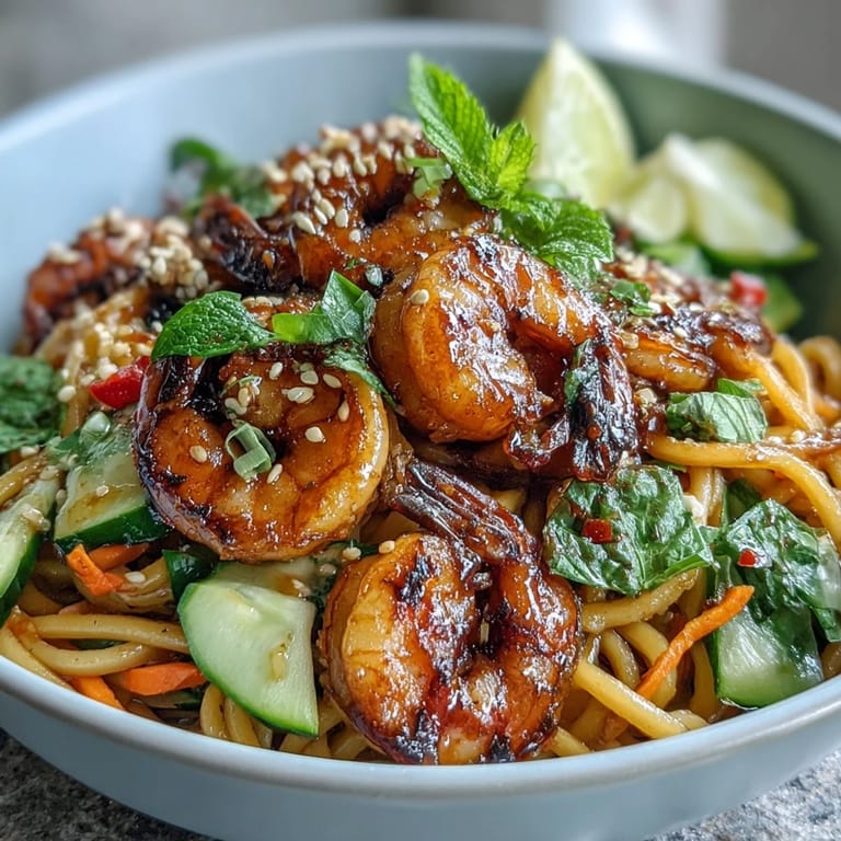 Save Quick, vibrant, and packed with flavor, this 15-Minute Asian Noodle Bowl With Grilled Shrimp is the perfect solution for a speedy weeknight dinner. It features succulent grilled shrimp served atop savory sesame noodles, finished with fresh, colorful vegetables and a zesty dressing.