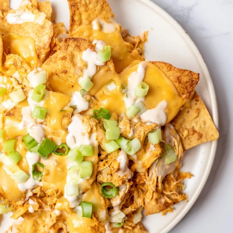 Save My neighbor knocked on the door holding a foil-covered tray, grinning like she'd just won something. Inside were these nachos, still warm, cheese barely set, and I didn't even wait for a plate. One bite and I understood why she made them every Sunday during football season. The tang of buffalo sauce cut through melted cheddar, and that cool ranch drizzle made everything make sense.
