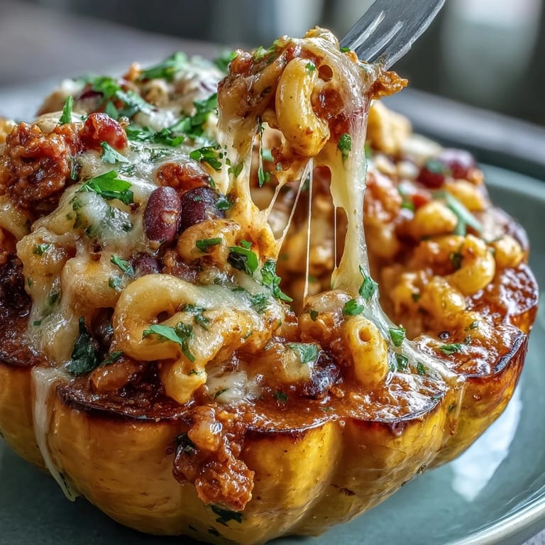 Save There's something magnetic about the combination of roasted squash and spicy comfort food that just works, especially when you're standing in your kitchen on a crisp autumn evening and realize you have most of what you need already tucked away. My discovery of this dish came quite accidentally—I had halved an acorn squash for roasting, then caught the smell of chili simmering on the stove and thought, why not bring them together? The first bite was a revelation: the sweet, creamy squash walls holding warm, spiced mac and cheese, all finished with a drizzle of hot honey that made everything pop with heat and complexity.