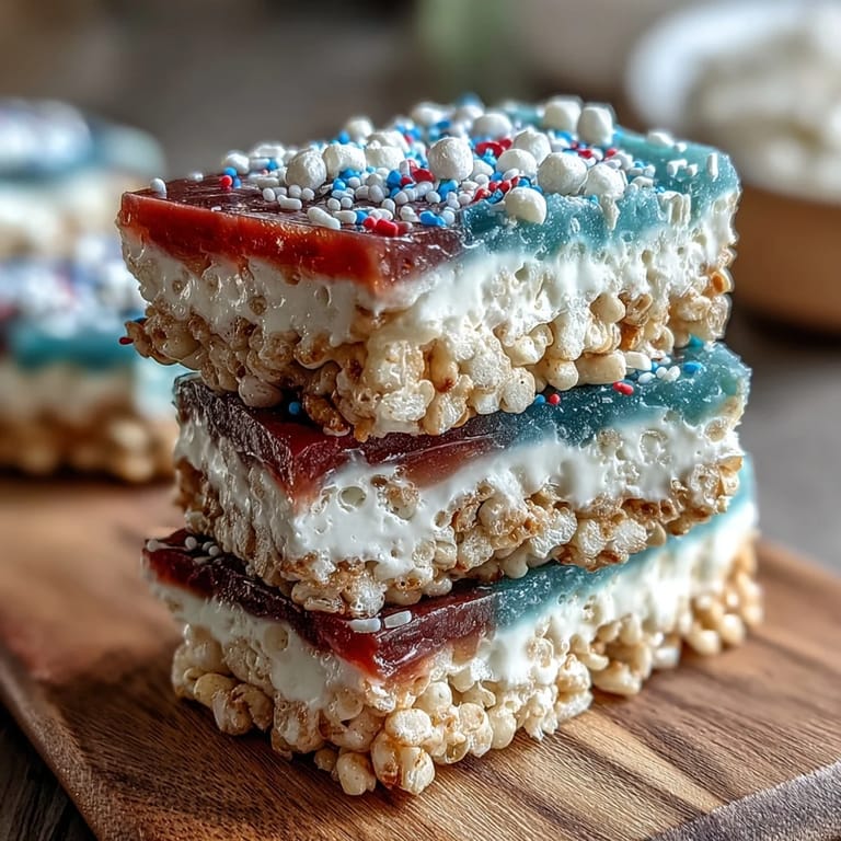 Save My neighbor showed up at my door one July afternoon with a pan of these striped treats, still warm from her kitchen, and I was honestly skeptical until I bit into that first square. The way the marshmallow melts on your tongue while the cereal stays crispy, and then that pop of color hits you—it felt like eating patriotism, which sounds ridiculous until you actually try it. Now whenever the Fourth rolls around, I find myself making batch after batch, pressing those sticky layers down with buttery hands and hoping the colors stay bold and true.