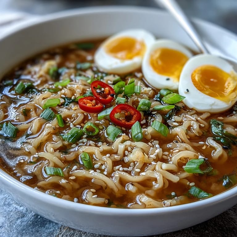 - Top each serving with the soft-boiled egg halves (if using), a scatter of fresh spring onion and sliced chili, a handful of fresh herbs, and a pinch of toasted sesame seeds. Each topping matters because it adds brightness and texture to every spoonful.